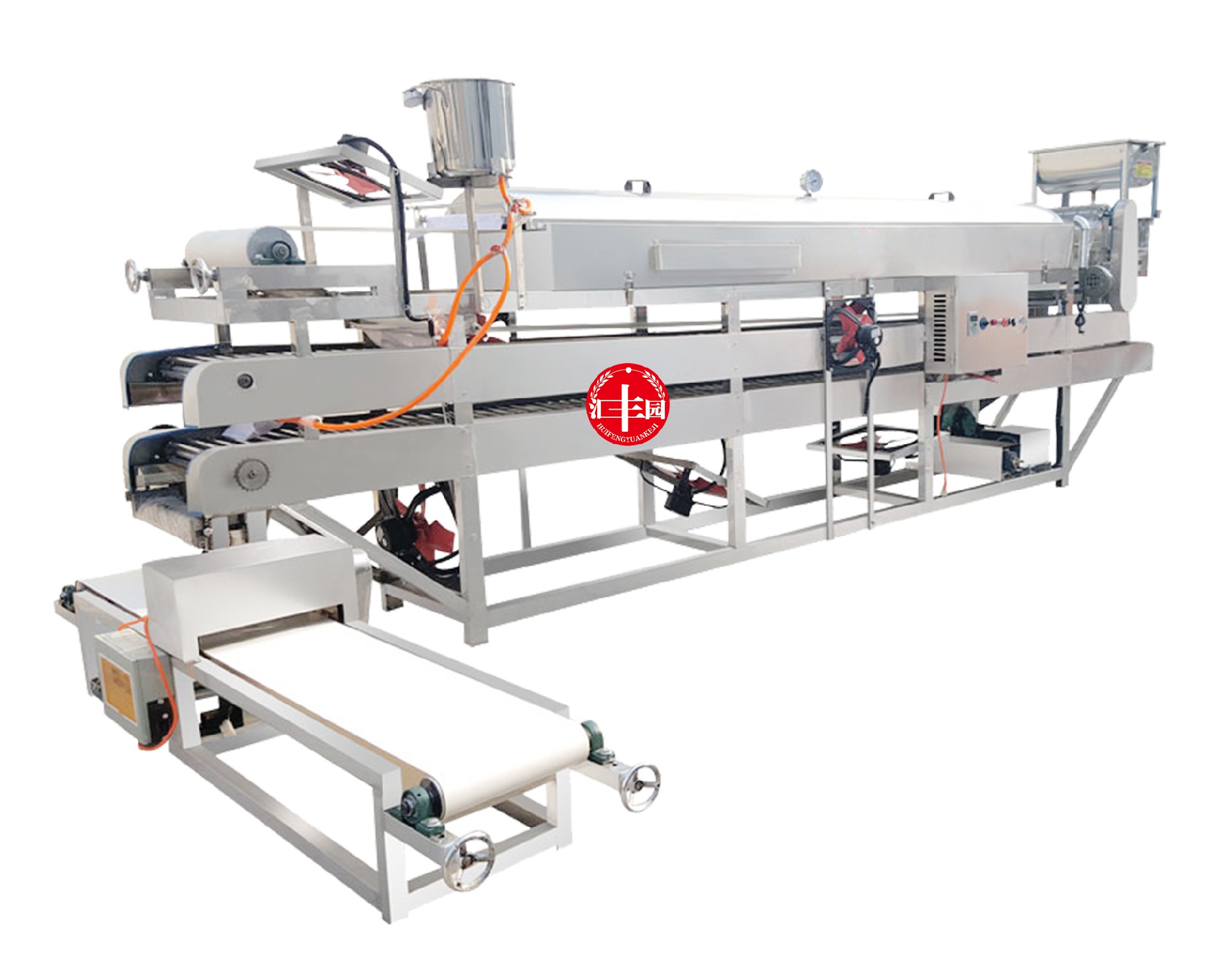 數(shù)控雙層冷卻涼皮機(jī)系全自動(dòng)型,將面漿、米漿、淀粉漿等原料加入漿桶后,可以自動(dòng)上漿,可生產(chǎn):折疊張、切條等形狀的制品,如涼皮、米皮、河粉、粉皮、米粉、大拉皮等。有時(shí)產(chǎn)200-3000斤涼皮(蒸箱長(zhǎng)度2-15米)多種型號(hào)大小的涼皮機(jī)供您選擇。本機(jī)機(jī)身及箱體采用優(yōu)質(zhì)不銹鋼制造,變頻控制、特氟龍布帶、自動(dòng)糾偏、自動(dòng)刷油、雙層傳送冷卻等操作簡(jiǎn)便,標(biāo)配電加熱,機(jī)器留有蒸氣管道,可以外接發(fā)蒸汽鍋爐等。機(jī)器切斷功能為單選產(chǎn)品,需要另購(gòu)買。